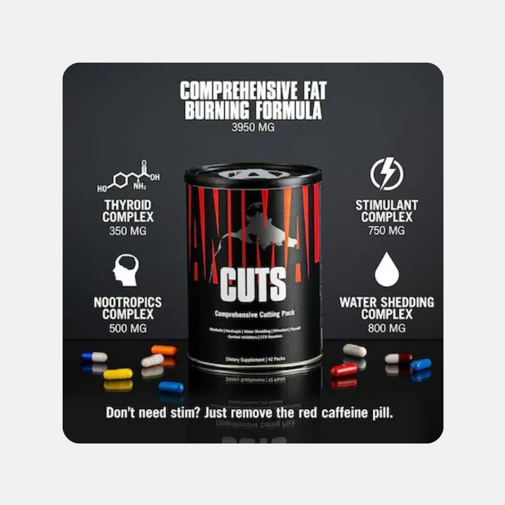 Enhance your fitness routine with Animal Cuts, featuring a blend of caffeine, amino acids, and plant extracts in convenient packs.