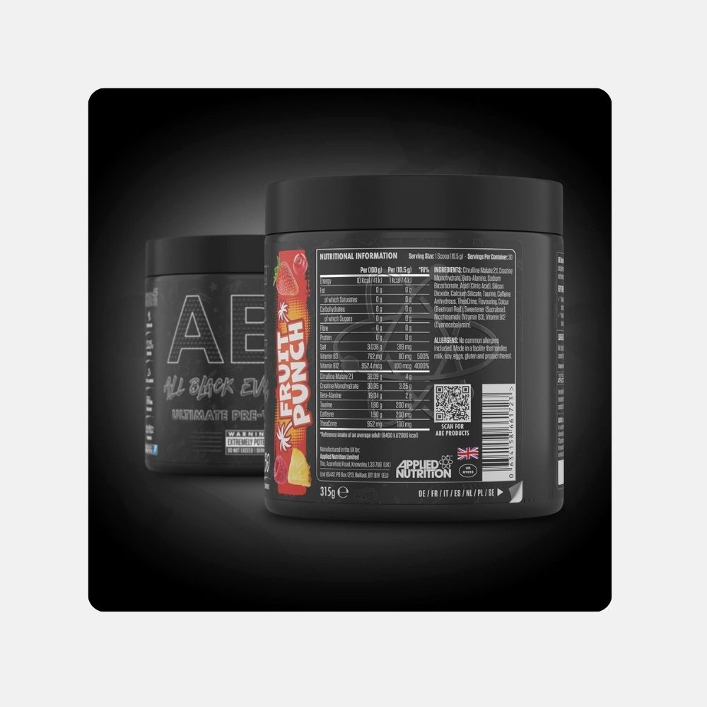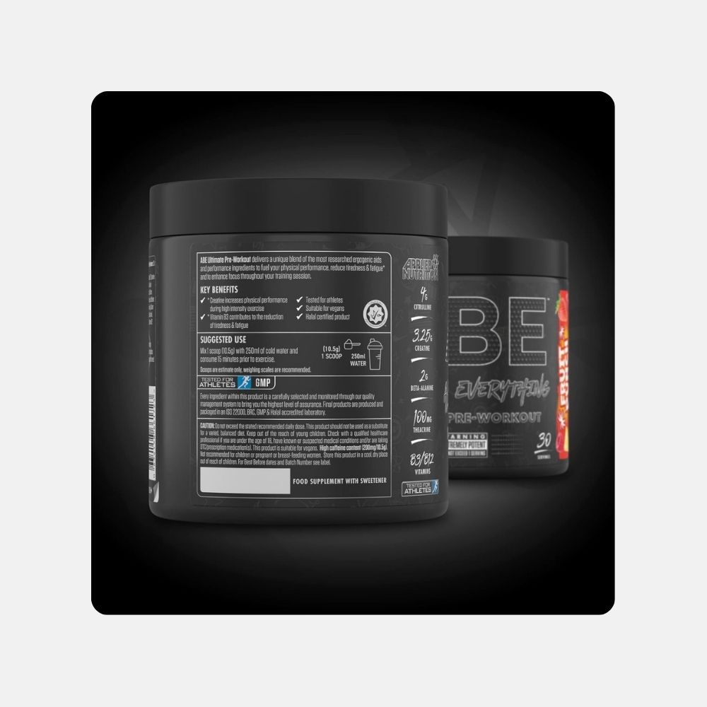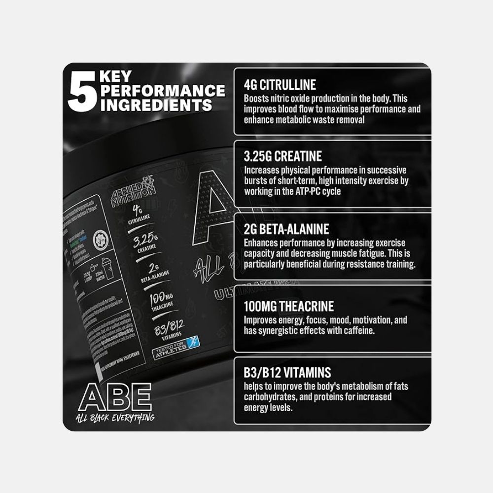 Elevate your workout with Applied Nutrition ABE Pre-Workout Powder, featuring essential ingredients like Citrulline Malate and Caffeine to support your performance.
